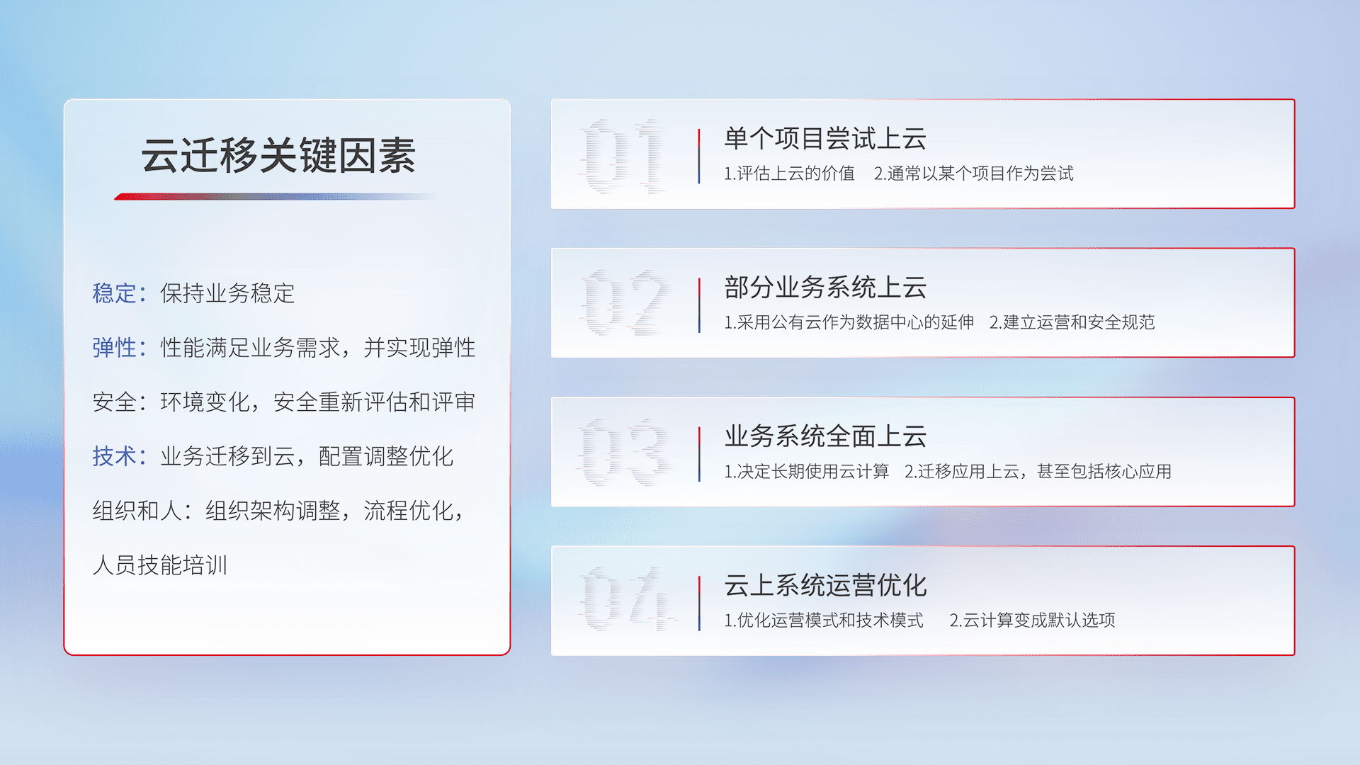 结合实际业务,,,,从规划设计、、、云平台选型、、、、云原生改造、、、、数据迁移、、集成交付,,,迁移全过程为客户识别最佳上云路径,,,,做好风险识别管理,,设计网络架构、、、身份权限、、、、安全审计合规、、、操作审计、、日志审计、、、、监控告警策略、、、多站点容灾设计等,,对云上基础设施进行整体规划,,,提升IT治理水平,,以满足弹性、、、、高可用、、、高性能的需求。。。